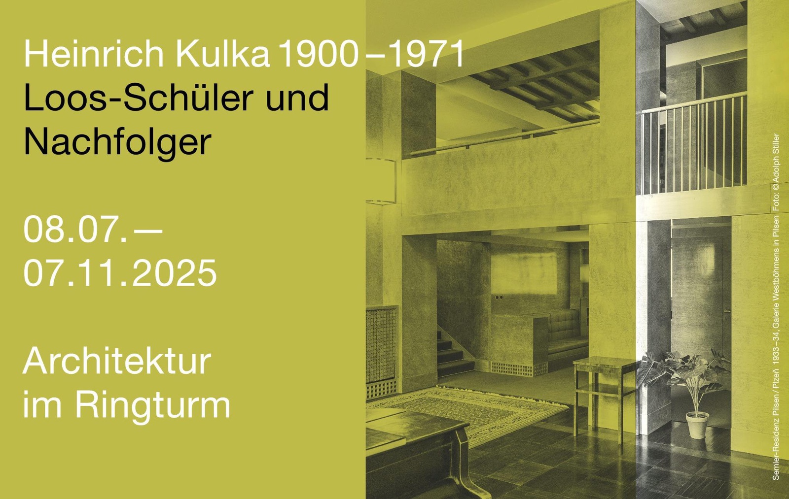 Die Sommerausstellung der Reihe „Architektur im Ringturm“ widmet sich ausführlich dem eigenständigen Werk Heinrich Kulkas vor seiner Emigration. Neben einigen Wiener Arbeiten aus der Zeit vor 1938 (erste Emigration nach Hradec Králové / Königgrätz) stehen vor allem seine in Böhmen realisierten Bauten im Fokus, die ganz dem Gedanken des Raumplans verpflichtet sind. Diese Projekte konnte Kulka in seiner ursprünglichen Heimat noch vor seiner endgültigen Emigration nach Neuseeland im Jahr 1940 verwirklichen.