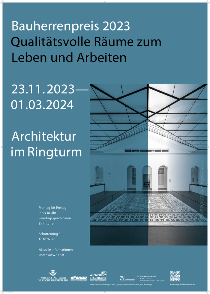 Die Zentralvereinigung der Architekt:innen Österreichs verleiht seit 1967 regelmäßig den Bauherr:innenpreis. Der Preis honoriert Persönlichkeiten oder Personenkreise, die sich als Bauherr:in oder Auftraggeber:in und Mentor:in für die Baukultur in besonderer Weise verdient gemacht haben. Im Mittelpunkt der Schau im Ringturm werden bis 1. März 2024 die drei Siegerprojekte ausführlich aufbereitet in Text und Bild präsentiert. Weiters sind die 25 nominierten Projekte der Shortlist 2023 (ermittelt aus 110 Einreichungen) zu sehen sowie zusätzlich die fünf Siegerprojekte des Jahres 2022. Tauchen Sie ein in einen Querschnitt zeitgenössischer Architektur made in Austria.